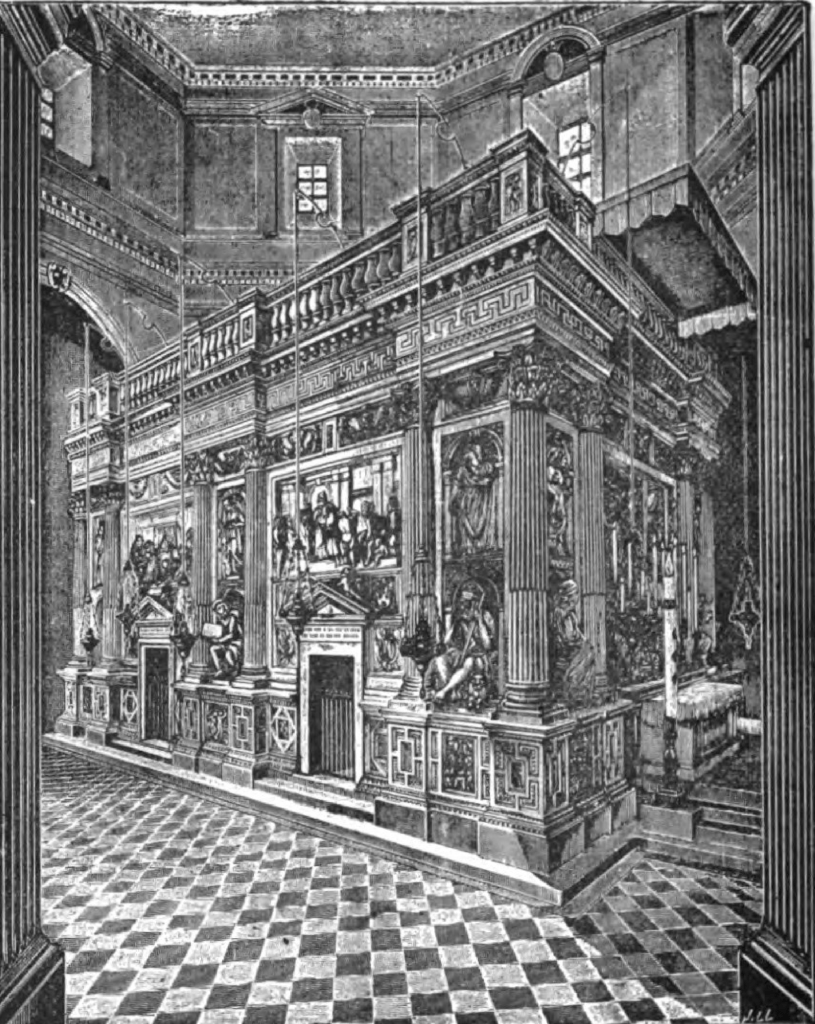 A sagrada Morada está envolta no mais fino mármore de Carrara; mas, se fosse branco como neve, não seria puro o suficiente para tocar as paredes sagradas que encerra. A beleza aqui consagra a santidade, mas se distancia dela, em sinal de indignidade, e como para mostrar que esta Casa, carregada pelas mãos dos anjos, não precisa de suportes erguidos pelas mãos dos homens.