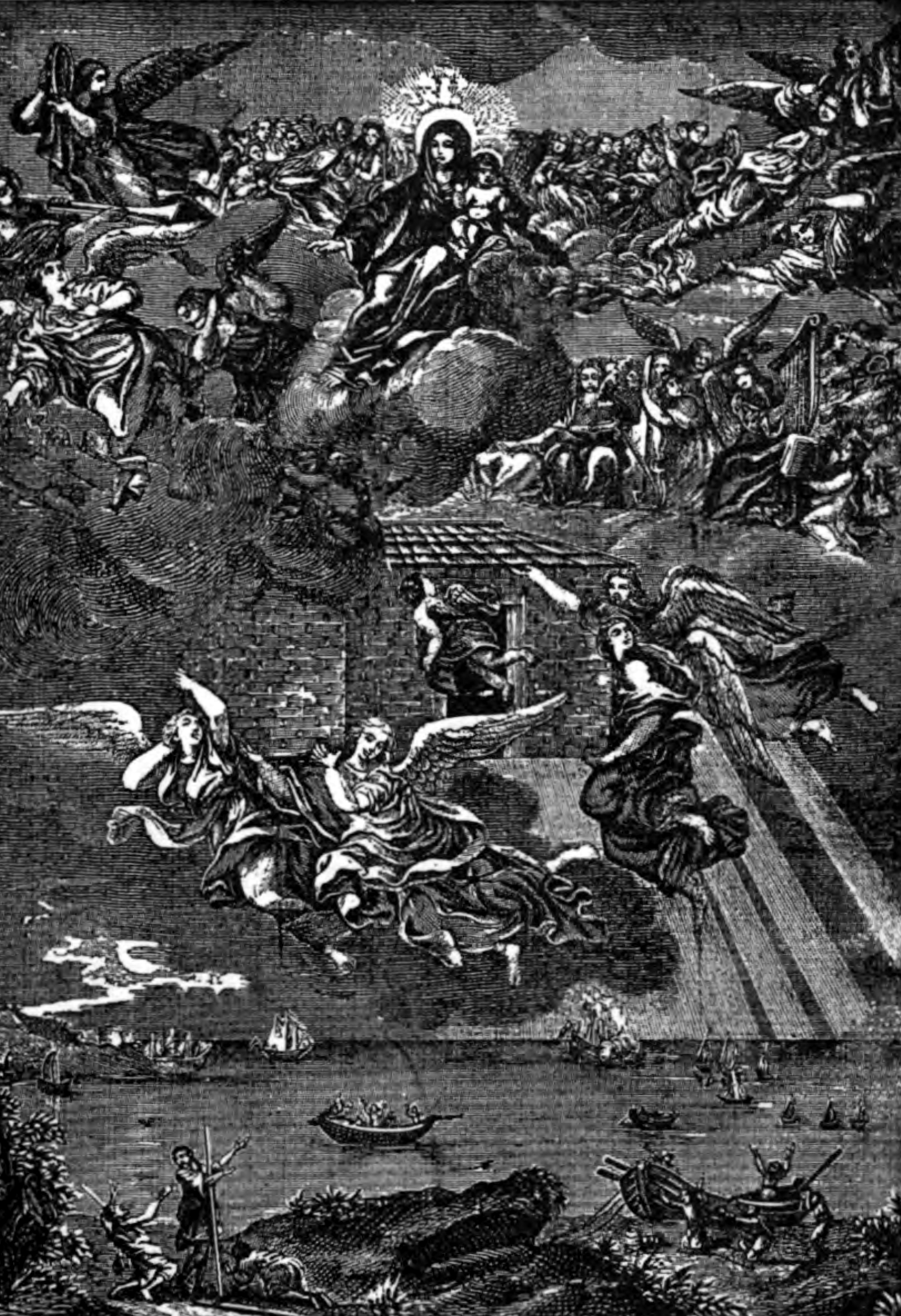 No meio da escuridão de uma noite tempestuosa de inverno na costa da província de Ancona, de repente aparece no mar uma luz brilhante que se aproxima quase a cada instante. Como a coluna de fogo que Israel atravessa o Mar Vermelho, está passando pelo Mar de Adria. Como a carruagem de fogo do profeta São Elias levada por um redemoinho, ela avança rapidamente no ar. Assemelhando-se a um halo de glória, envolve algum objeto que ainda está envolto em mistério. É um bando brilhante de Anjos trazendo em suas mãos algum servo de Deus, como outrora eles levaram o Profeta Habacuc de Jerusalém para a Babilônia, e o corpo de Santa Catarina de Alexandria para o deserto do Monte Sinai? É um coro de Querubins escoltando a Arca da Aliança, e eles receberam a comissão de colocar no centro da Igreja aquela Arca sagrada que continha o Maná que desceu do Céu? Não. Observe bem a direção de seu vôo. Este comboio celestial está vindo em linha reta da colina de Tersatto! Todo este dilúvio de luz sobre o mar abrange, e este comboio celeste acompanha, a verdadeira Arca em que habitou o Pão Vivo do céu. Esses espíritos flamejantes receberam esse alto comando do Eterno; e esta maravilha que se aproxima dada à Itália, entre os cantos dos Anjos e o brilho de Deus, não é outra senão a Morada terrena Daquele que se digna ser o Pão de nossas almas imortais. Contemplar! A luz que avança passa sobre as ondas do Porto de Fiume. Como um navio, com anjos brilhantes como navegadores, vem aquele navio no qual o Senhor do céu embarcou quando Ele veio das costas celestiais. Tem a cruz por mastro, o manto de Maria por vela e o sopro de Deus, como uma brisa favorável, para fazê-lo deslizar velozmente sobre as águas. Ao leme está a Rainha dos Anjos, ao seu lado o Arcanjo São Gabriel Veja! Já chegou à costa! Agora percorreu meia légua em terra! Desça na mata da Senhora Laureta! As árvores se tornaram como a sarça em chamas que Moisés viu! E, como no sonho de José, os feixes de seu irmão se curvaram diante de seu feixe, assim as árvores dão testemunho silencioso da grandeza daquilo que chegou entre eles. Com as cabeças abaixadas, eles se curvam em homenagem; e assim permanecerão, em atitude de reverência, por quase 300 anos, para que incontáveis milhares possam contemplar e aprender a honra devida às sagradas Paredes que abrigaram o Deus Encarnado.