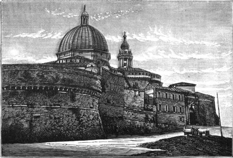 Uma vista ainda mais fina pode ser obtida do cume de Monreale, que é alcançado pela Porta Romana. O panorama é de beleza indescritível: o olho passa de pico a pico dos Apeninos, e de colina a colina coroada com cidades pitorescas, enquanto, a leste, brilha ao sol a estátua dourada da Virgem de Loreto, que sobressai da cúpula imponente que cobre sua amada Morada.