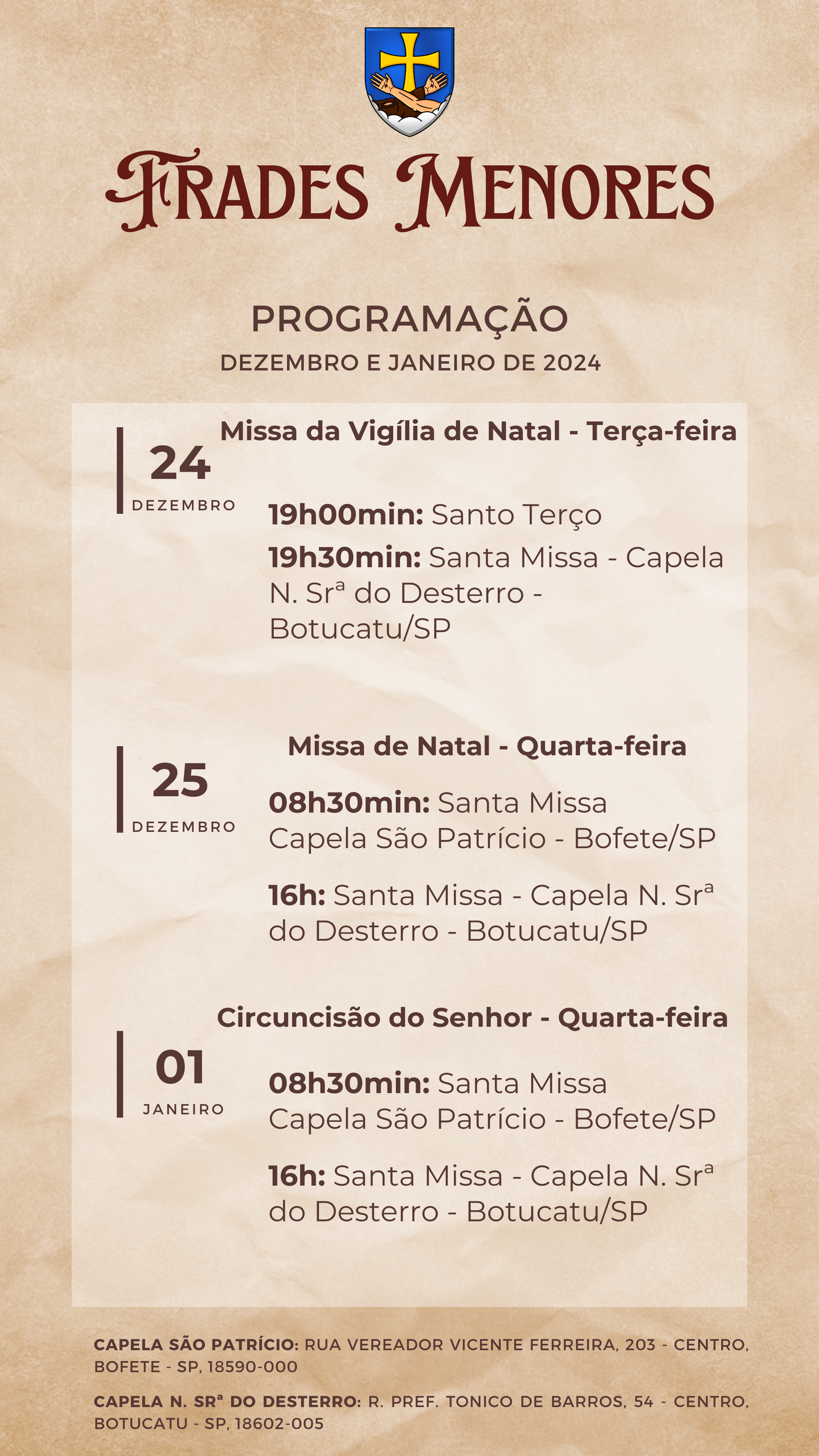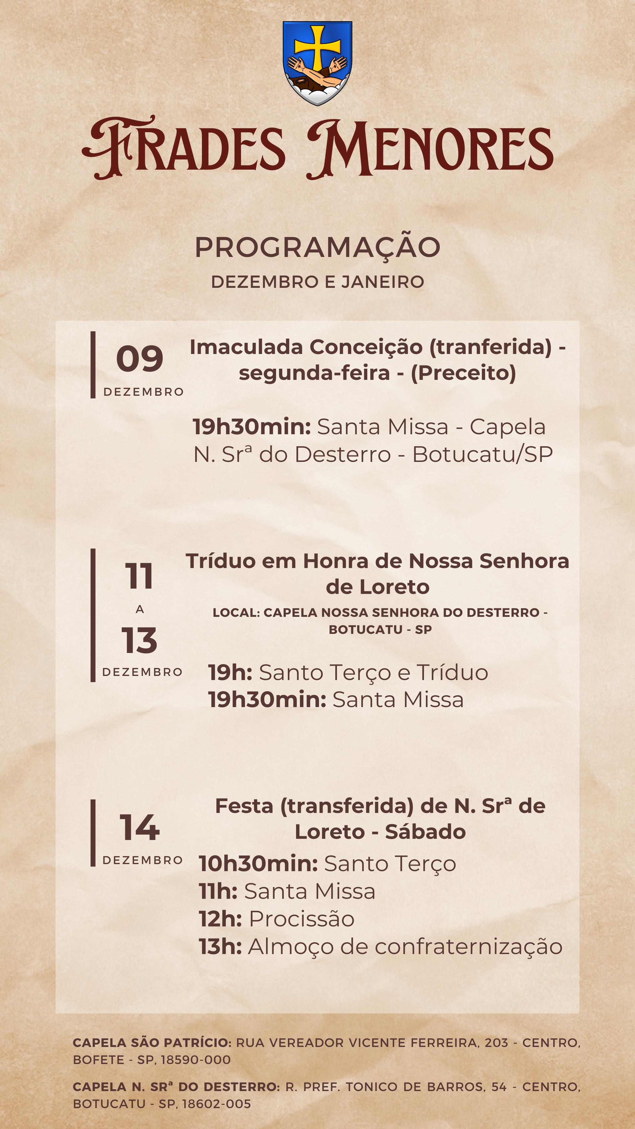 Eis que nos preparamos para as festividades de nosso Excelsa Padroeira, já temos datas oficiais: tríduo de 11 a 13 e a Festa de fato no dia 14, (festa transferida), esperamos que nossos Zeladores possam estar presentes nesta festa gloriosa. No dia 14 de dezembro, teremos a Missa Cantada, Procissão com a imagem de Nossa Senhora de Loreto e após um almoço de confraternização. Aproveito a ocasião para divulgar a programação do Frades Menores para dezembro e janeiro.
