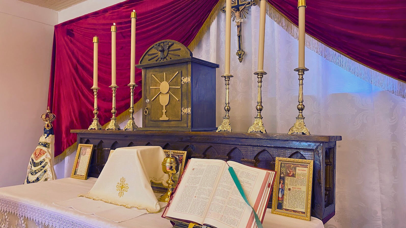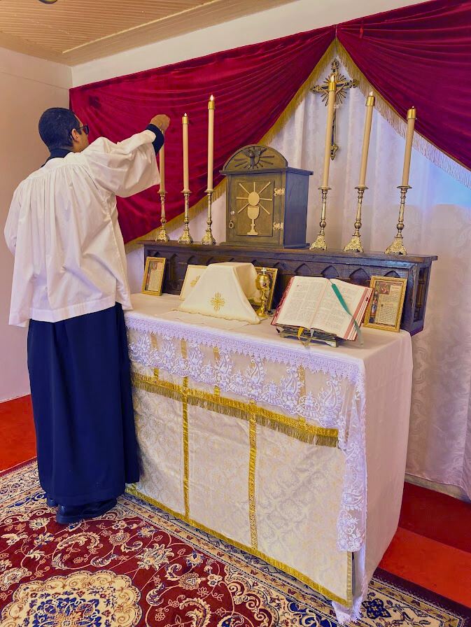 Para proporcionar maior espaço ao sacerdote durante a celebração da Santa Missa, foi necessário substituir o retábulo onde se encontrava a imagem da Virgem Lauretana por um degrau. Isso porque o retábulo ocupava muito espaço, e o teto da capela é bastante baixo.