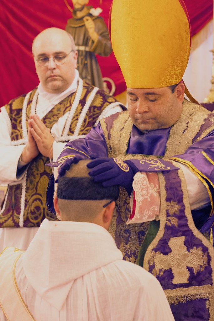 Passemos agora a algumas notícias que marcaram a vida de nossa Pia União. Ainda que celebremos com solenidade a festa de nossa Excelsa Padroeira, nossa grande celebração deste ano ocorreu por ocasião das Ordenações realizadas em nossa amada Capela-Sede da associação. Referimo-nos aos dias de 15 a 22 de dezembro, quando recebemos, no Convento de São Miguel e de Santo Antônio, Sua Excelência Reverendíssima Dom Rodrigo Henrique Ribeiro da Silva, Bispo da Santa Igreja, que veio conferir as Sagradas Ordens a nossos confrades, inclusive a ordenação sacerdotal do hoje Reverendo Padre Frei João Maria Vianney, O. F. M. Sub.